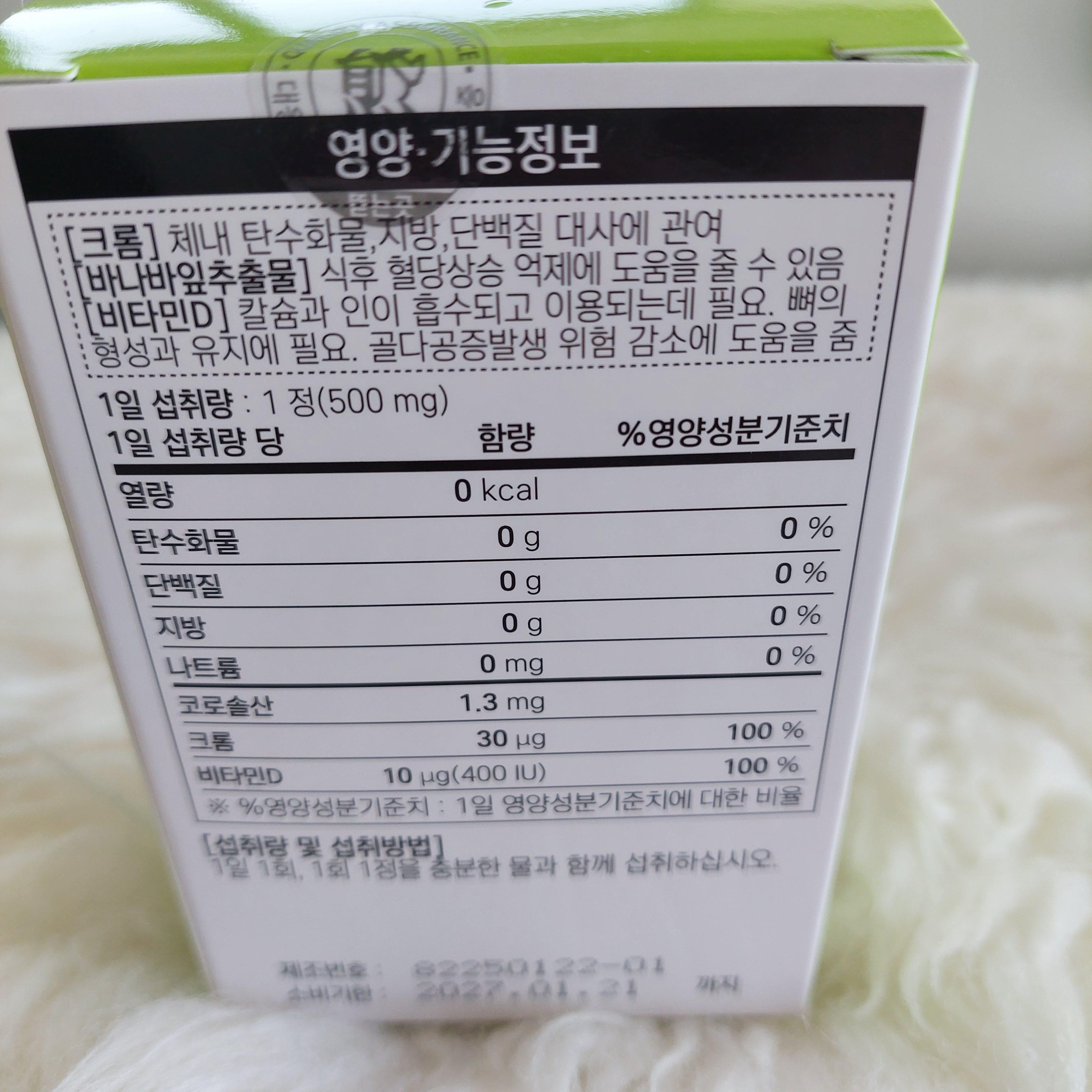 건조효모 크롬함유 에스토니아산, 바나나잎추출물 인도산, 비타민 D, 옥수수전분 등 있네요.